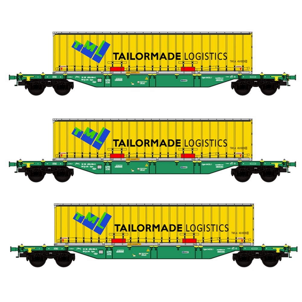 B-models 54305 / Set met 3 NMBS containerwagons Lineas, beladen met 3  bache containers Tailormade Logistics